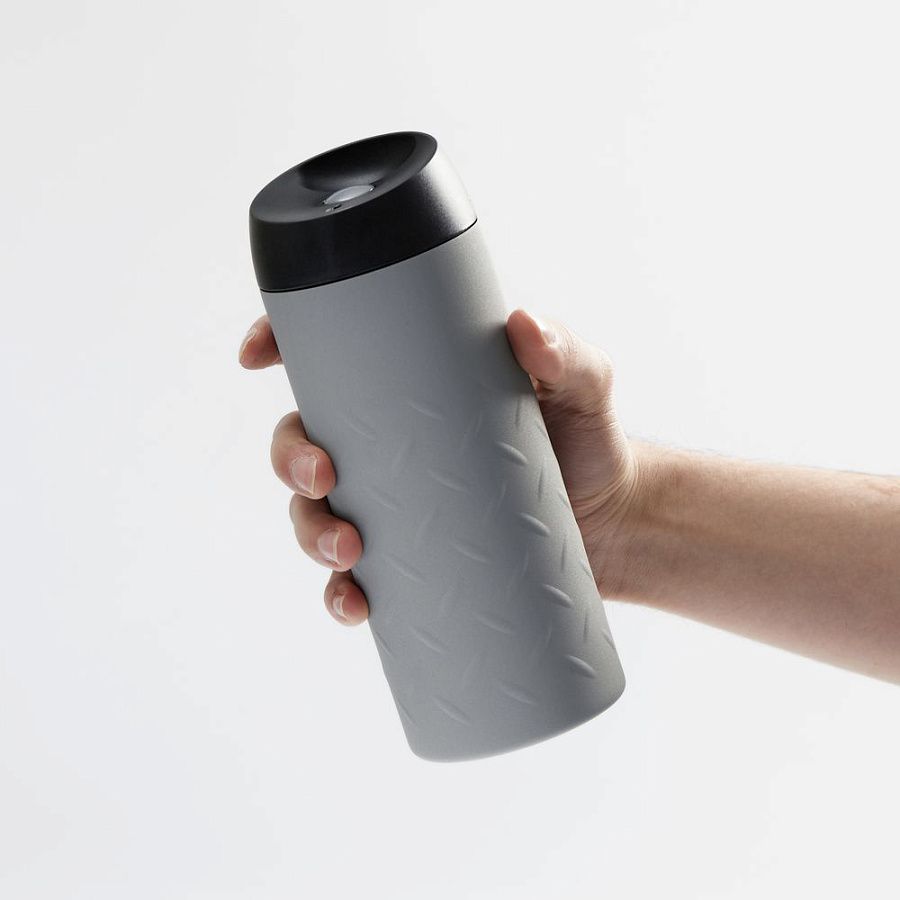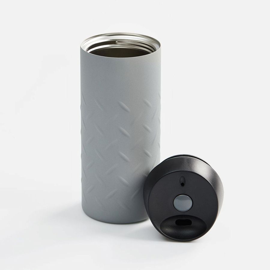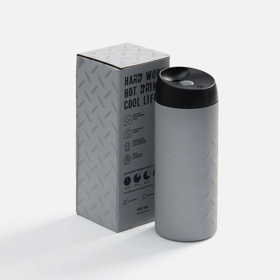 Двухслойная вакуумная конструкция из нержавеющей стали. Герметичная завинчивающаяся крышка с нажимным клапаном для питья. Стакан подходит для большинства автомобильных подстаканников.