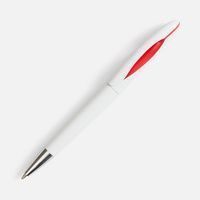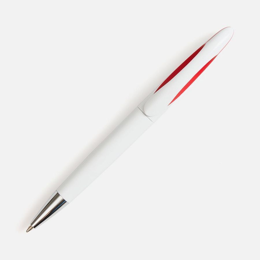 Шариковая ручка приятных округлых форм с белым глянцевым корпусом и цветовым акцентом.