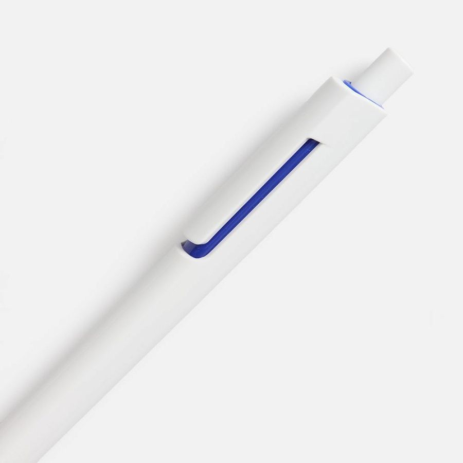 Шариковая ручка с глянцевым белым корпусом и цветовым акцентом у клипа, который дополнит логотип компании.