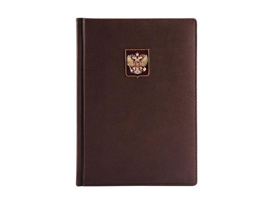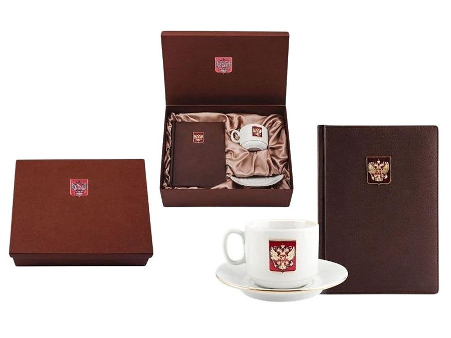 Ежедневник формата А5 с декором "Герб РФ на щите" и фарфоровая чайная пара с золотой отводкой края чашки и блюдца декорированная металлическим барельефом "Двуглавый орел".