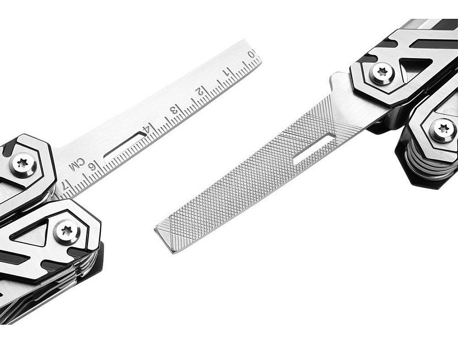 Универсальный мультитул предлагает 21 функцию, включая плоскогубцы с игольчатым наконечником, обычные плоскогубцы, кусачки для проволоки, нож с плоской кромкой, магнитную отвертку с 8-функциональными насадками, линейку / напильник, зазубренный нож, открывалку для бутылок, консервный нож, шило, мини-отвертку с прорезями. Все функции оснащены предохранительной блокировкой.