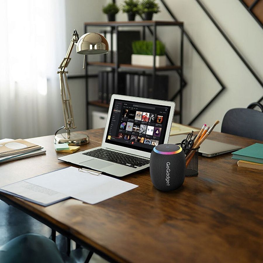 Небольшая, но мощная колонка с подсветкой и карабином.