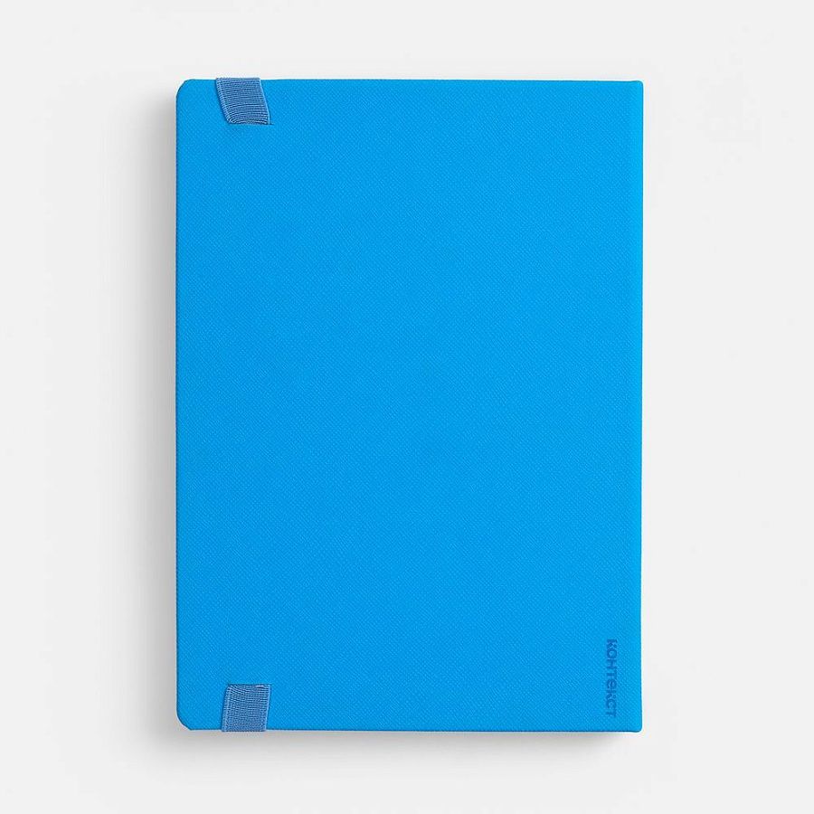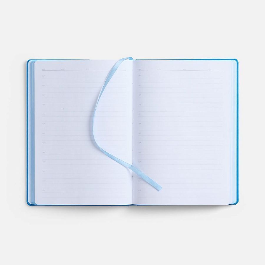 Ежедневник с твердой обложкой, выполнен из материала Nice Touch, голубой JJ, дополнен резинкой с шильдой из материала Soft Touch Ultra и ляссе в цвет обложки.