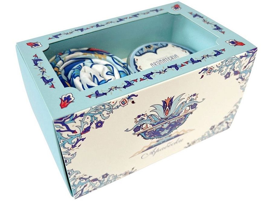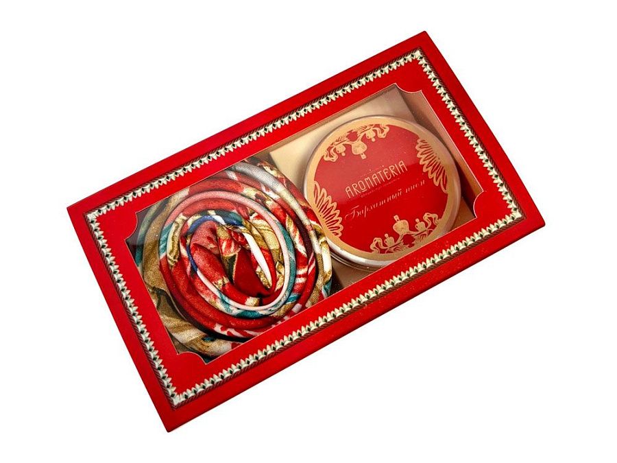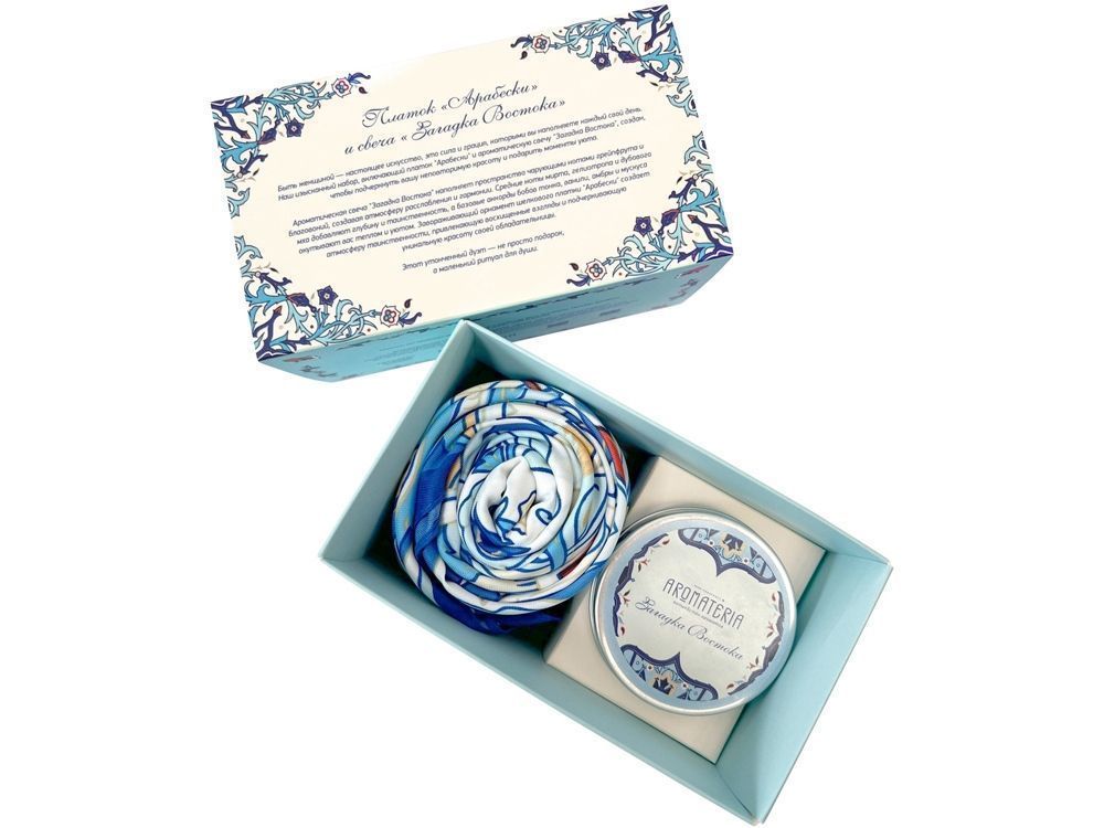 15 х 8,5 х 8,5 см, платок 90 х 90 см, свеча d6,5 х 5