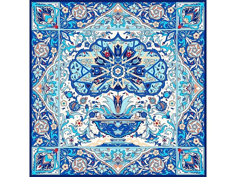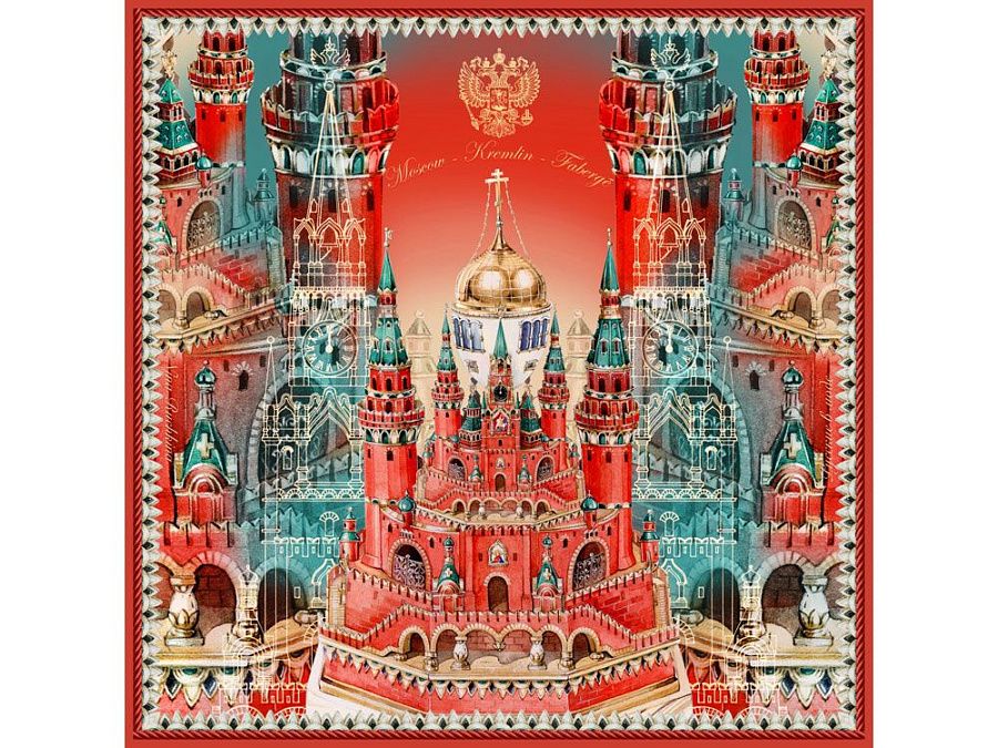 Платок «Кремль – Москва» в шелке воплощает шедевр ювелирного искусства Карла Фаберже из серии подарков для русской императорской семьи. В центре полотна расположен Успенский собор в обрамлении башен Московского Кремля. Утонченный рисунок, яркое цветовое решение и глубокий символизм дизайна платка созданы для эффектного акцента праздничного образа.
