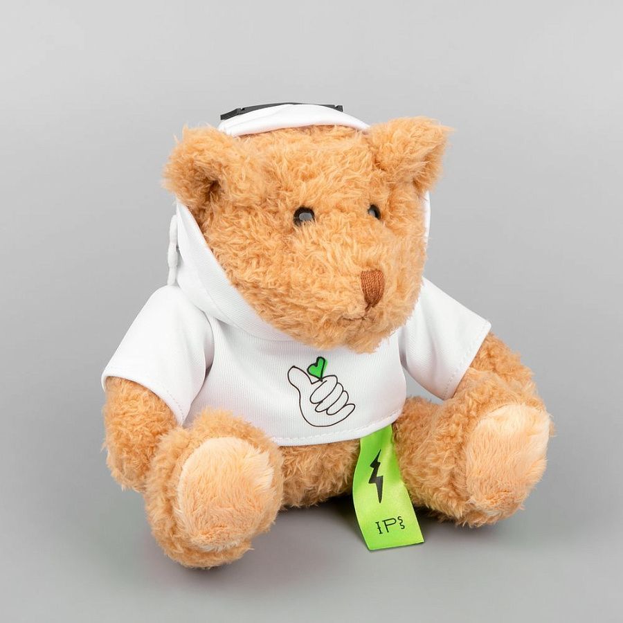 Белое худи позволяет нанести полноцветное изображение — так мишка станет по-настоящему уникальным.