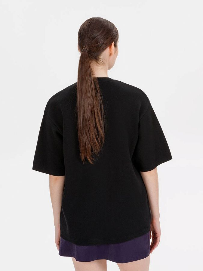 Siluetti Volumica — плотный вязаный джемпер-футболка прямого кроя с круглым вырезом и спущенной линией плеча. Фирменная бирка из силиконовой ленты станет интересной деталью, привлекающей внимание на фоне общей лаконичности модели.