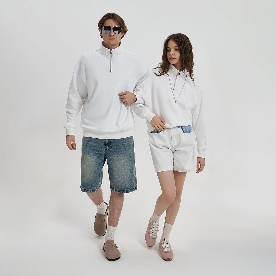 Универсальная толстовка с воротником-стойкой и заниженной линией плеча. По нижнему краю и на рукавах — эластичные резинки для комфортной и аккуратной посадки. Модель застёгивается на металлическую молнию.