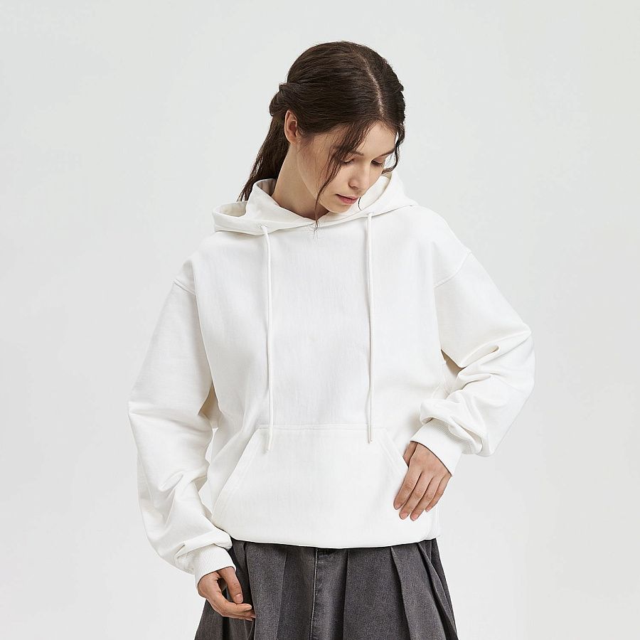Модель выполнена из хлопкового футера плотностью 420 г/м (без начёса). Плотная, но мягкая ткань хорошо держит форму и при этом приятна к телу. Использована пряжа compact penye — прочная, тактильно деликатная, высокого качества.