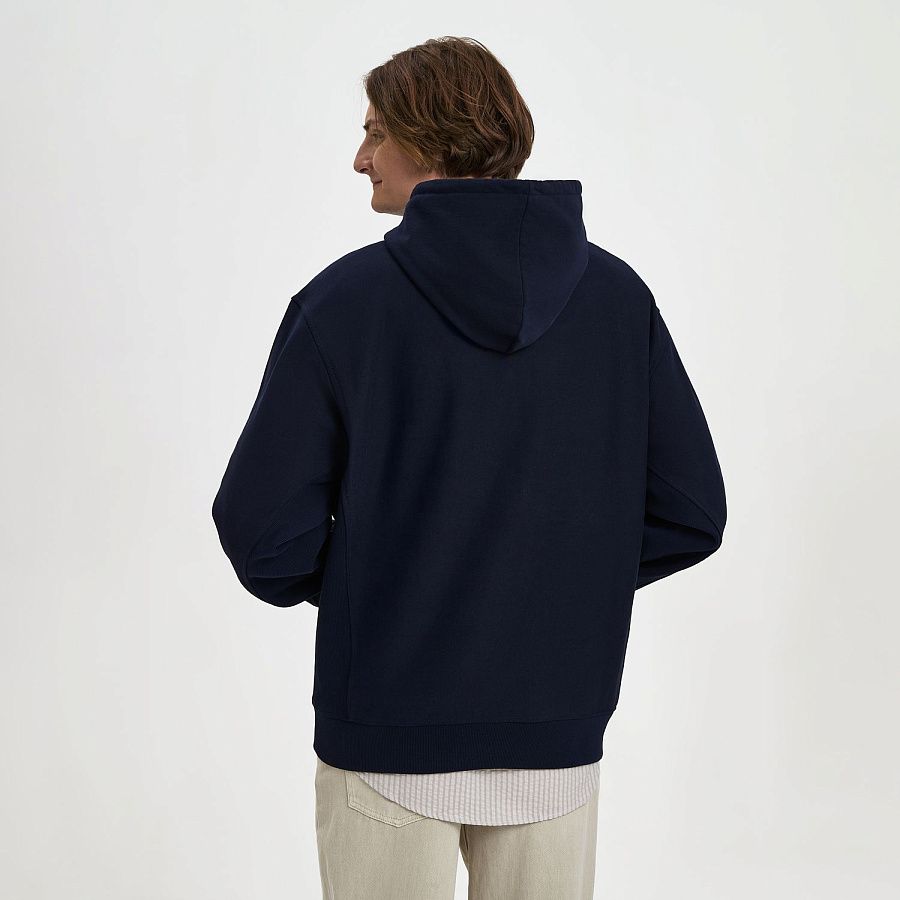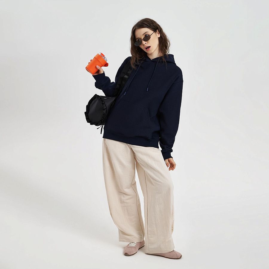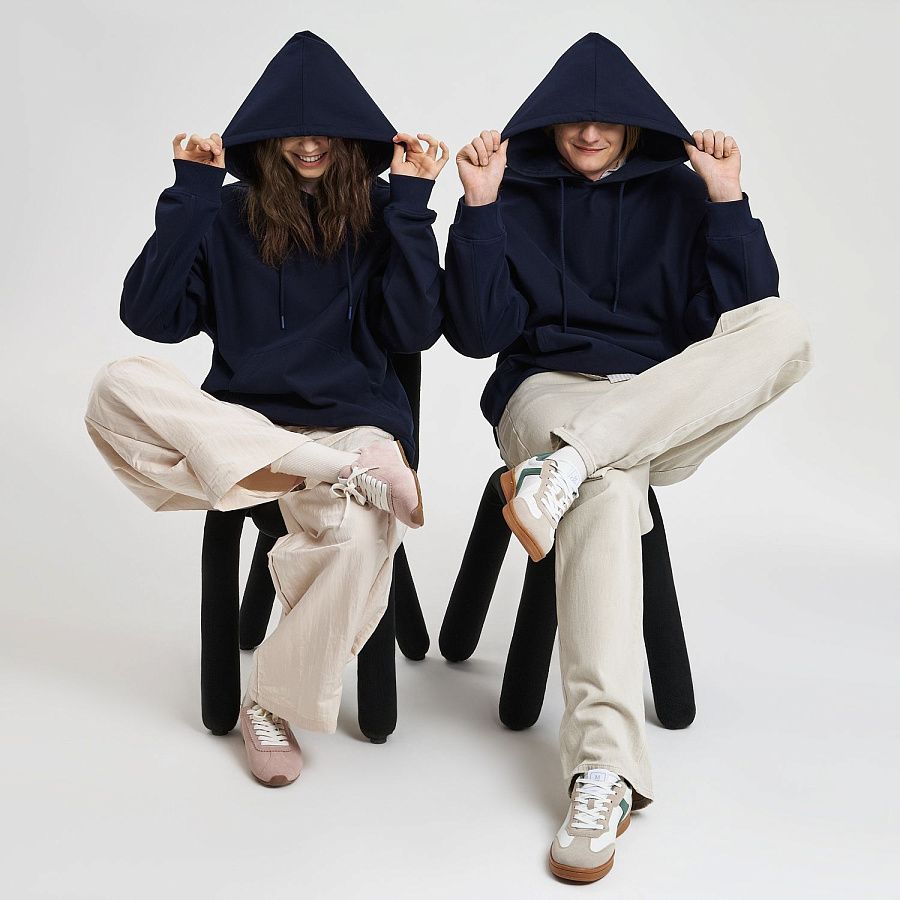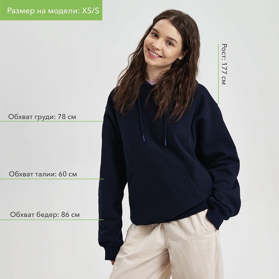 Модель выполнена из хлопкового футера плотностью 420 г/м (без начёса). Плотная, но мягкая ткань хорошо держит форму и при этом приятна к телу. Использована пряжа compact penye — прочная, тактильно деликатная, высокого качества.