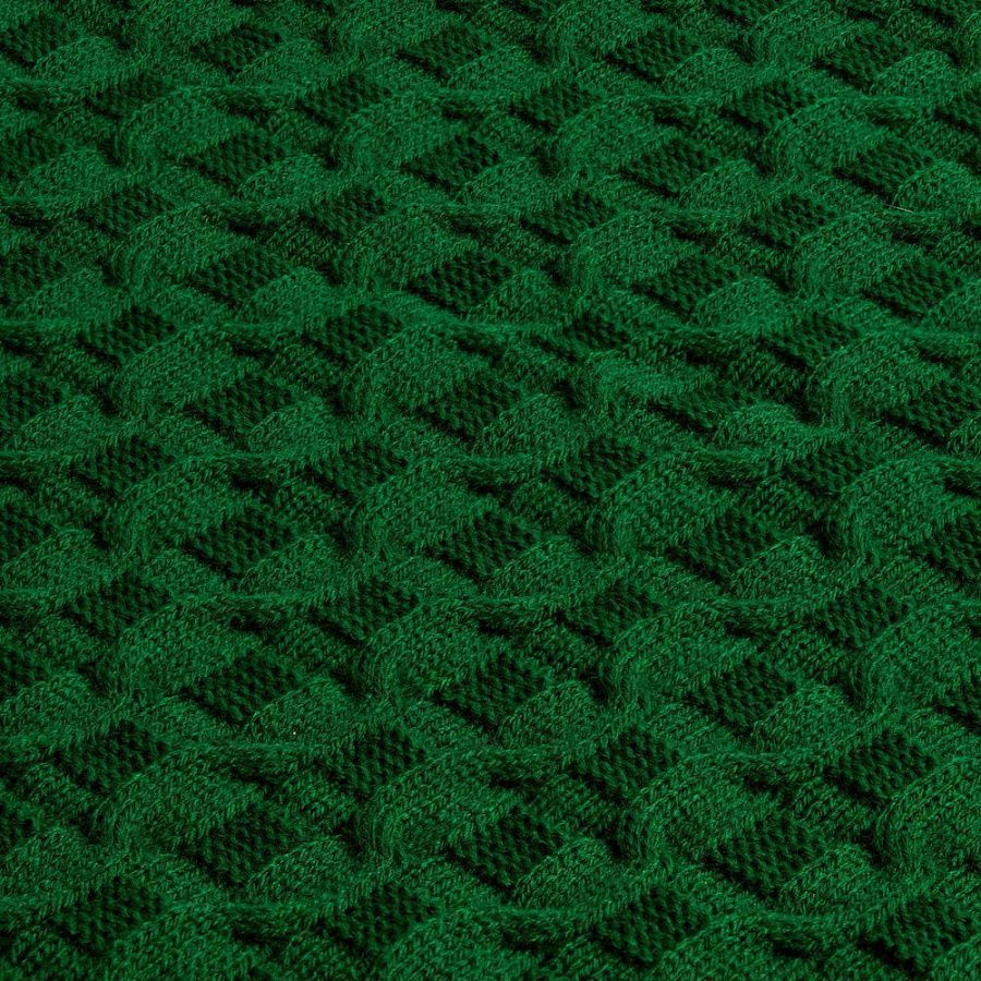 Модель: однотонный плед с фактурной вязкой, которая позволяет сделать его воздушным и объемным. Чередуя различные типы петель на гладком полотне, можно вывязать любую графику — логотип, текст, товарный знак.