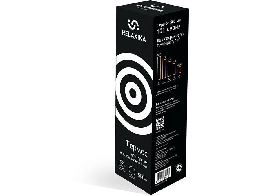 Классический термос Relaxika черного цвета с высокими показателями удержания температуры напитка для походов, путешествий, спорта и ежедневного использования. Прочные двойные стенки из высококачественной нержавеющей стали 18/8 с вакуумной изоляцией гарантируют, что ваш напиток останется холодным в течение 36 часов и горячим до 30 часов. Этот материал не только прочен, но и гигиеничен, не выделяет никаких вредных для здоровья веществ. Ваши напитки сохраняет естественный вкус и не приобретут посторонний запах.