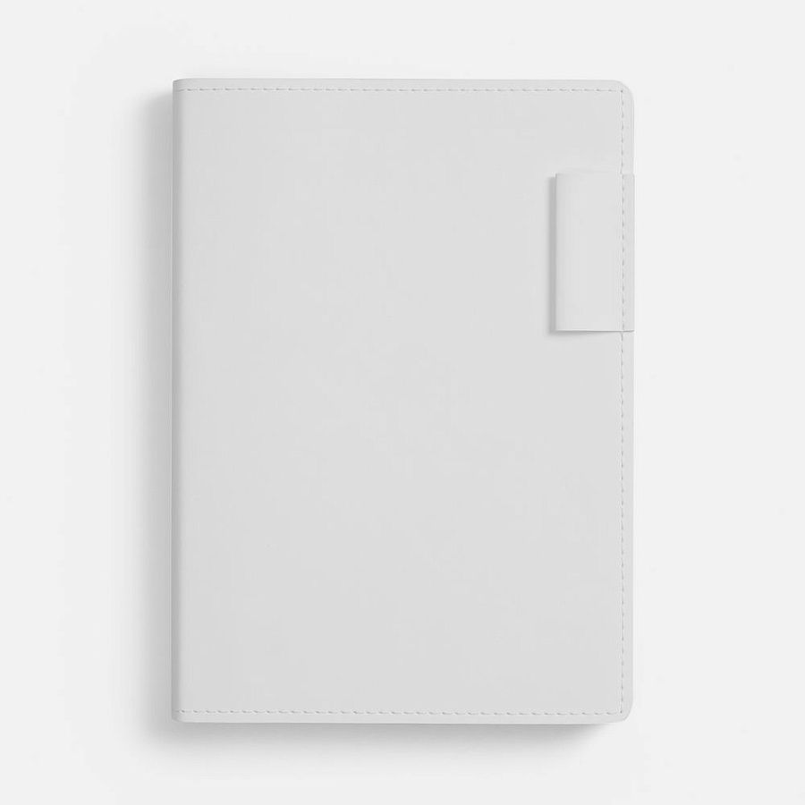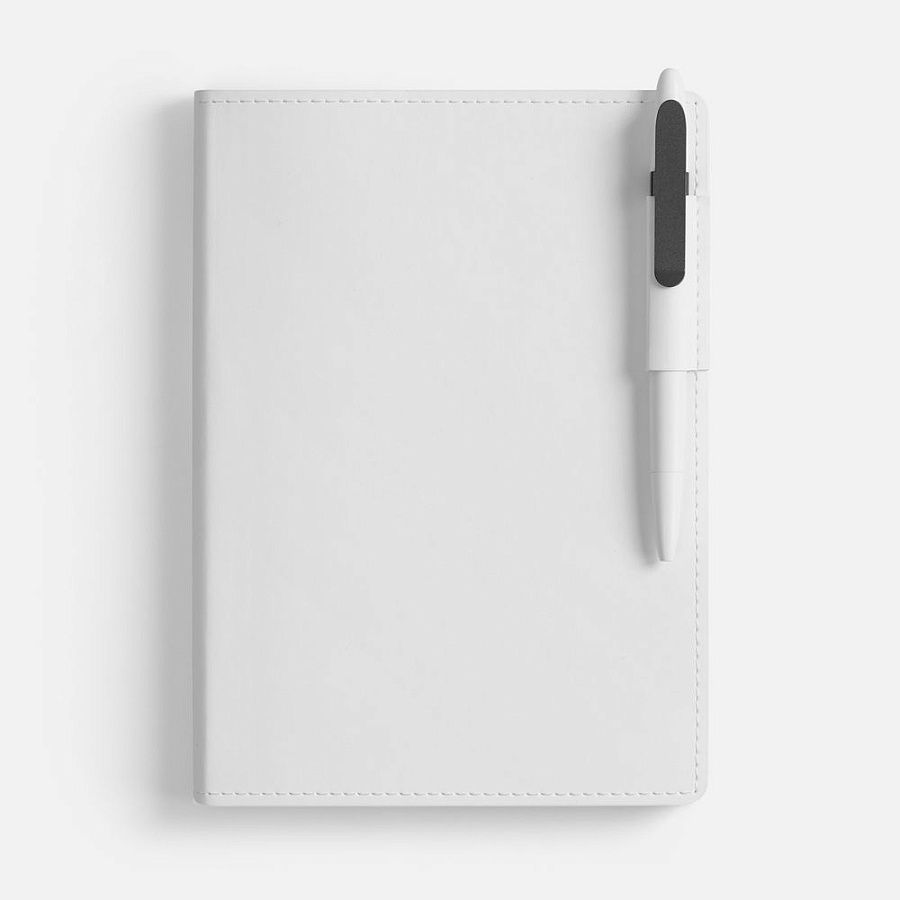 Ежедневник с гибкой обложкой из материала Soft Touch, белый BB, дополнен петелькой из покровного материала для ручки, капталом, ляссе и закрашенным срезом обложки в цвет материала.