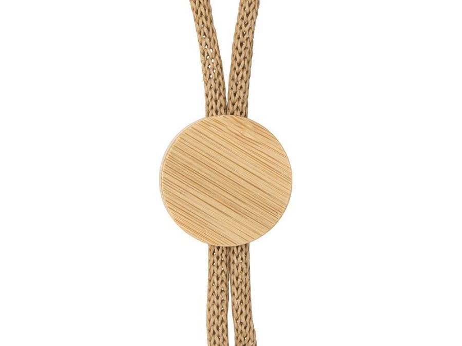 Шнурок изготовлен из переработанной бумаги и дополнен бамбуковой плашкой, на которую можно нанести логотип.