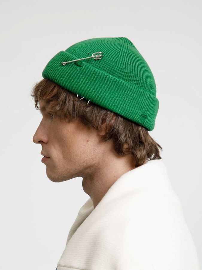 Однослойная шапка бини с рваным отворотом и металлическими аксессуарами для дерзких образов в любом возрасте. Яркий и запоминающийся акцент в стиле гранж.