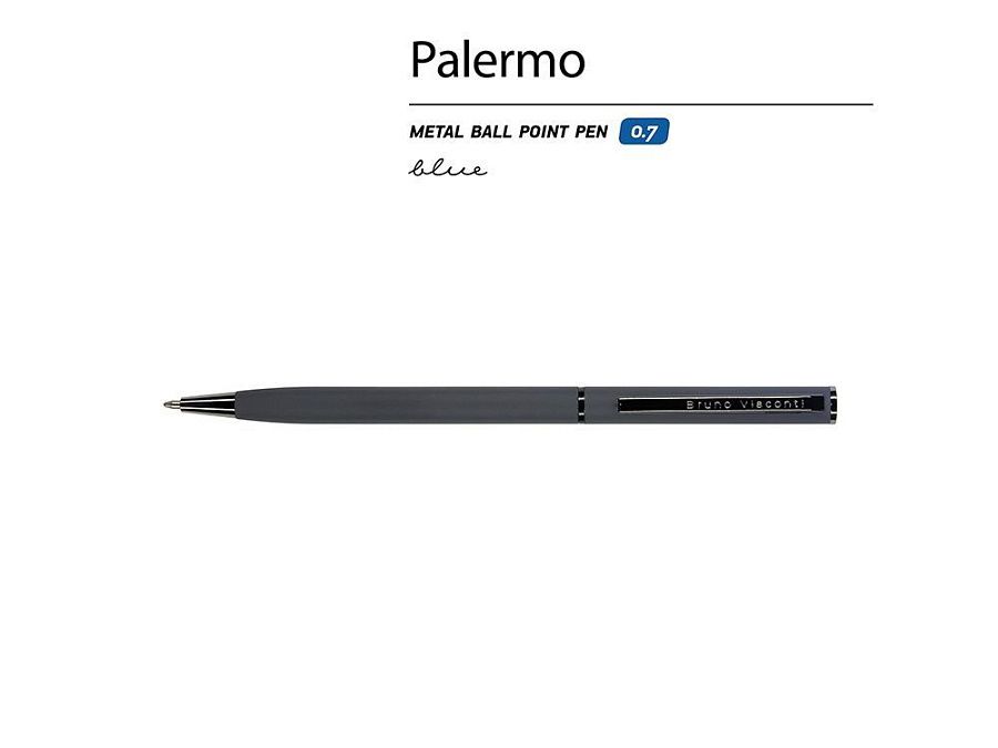 Автоматическая металлическая ручка "Bruno Visconti" серии "Palermo" однотонного цвета порадует любителей всего изящного и утонченного. Покрытие корпуса Soft Touch гарантирует дополнительный комфорт в работе с ней. Стержень легко выдвигается благодаря поворотному механизму. Синие пигментные чернила Dokumental (Германия) и пишущий узел Premec (Швейцария) обеспечивают качественное и мягкое письмо.