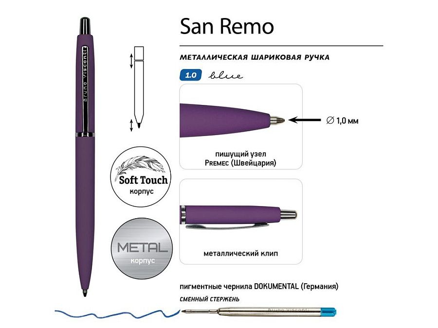Как и все подарочные ручки «Bruno Visconti», «San Remo» - обладательница стержня с пишущим узлом от швейцарского производителя Premec и перманентными чернилами немецкого производителя Dokumental. Поэтому можно быть абсолютно уверенным в качестве письма.