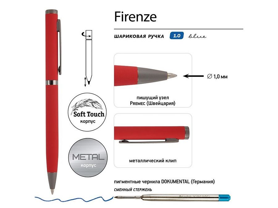 Ручка автоматическая, с легким поворотным механизмом подачи стержня. Надежный пишущий узел d 1,0 мм (от швейцарского производителя Premec) гарантирует высокое качество также, как и пигментные чернила Dokumental (Германия). Благодаря им писать ручкой «Firenze» одно удовольствие – она мягко скользит по поверхности бумаги, оставляя ровную, четкую линию.