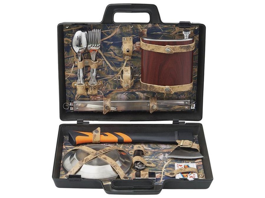 Все аксессуары упакованы в пластиковый кейс и надежно закреплены ремешками из натуральной кожи, что обеспечивает удобство транспортировки и сохранность содержимого.