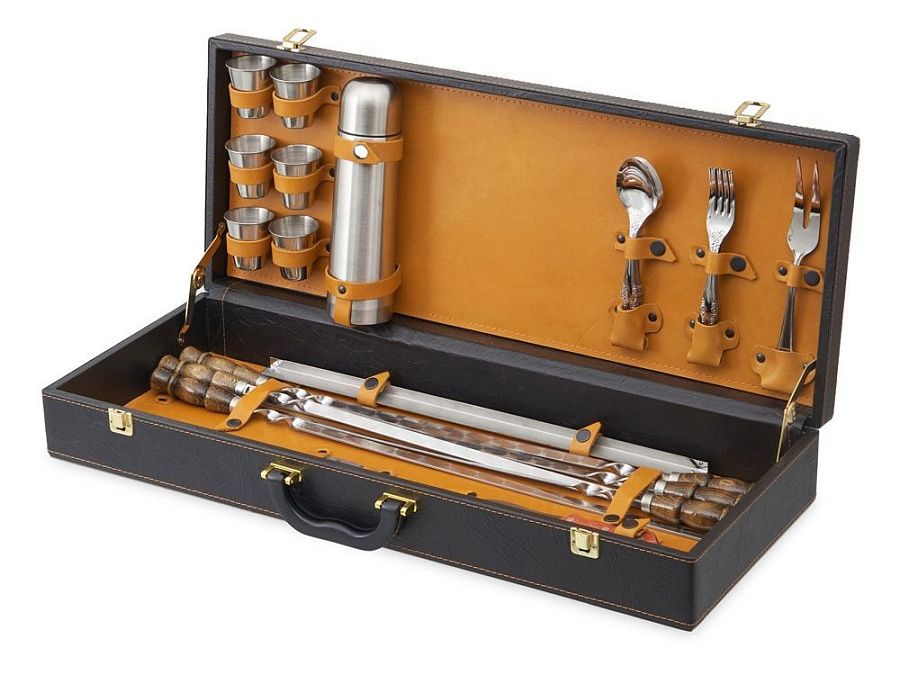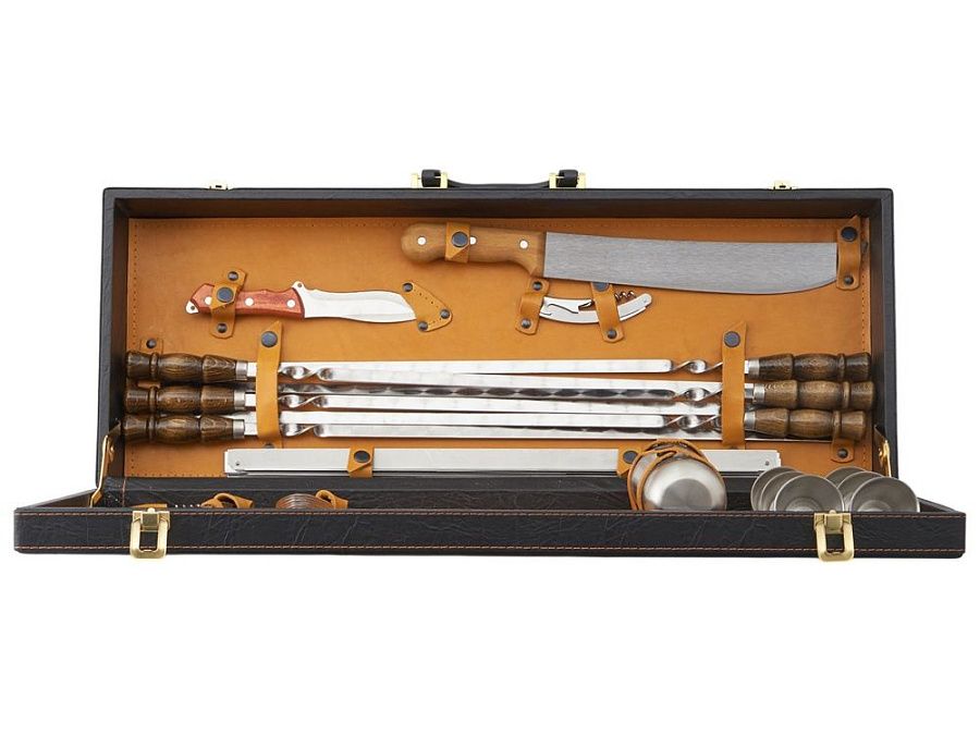 Все аксессуары надежно крепятся к кейсу кожаными ремешками на кнопке, обеспечивая удобство транспортировки и сохранность содержимого.