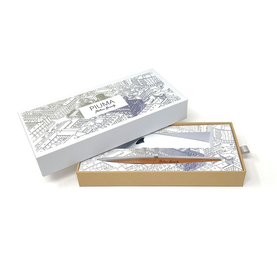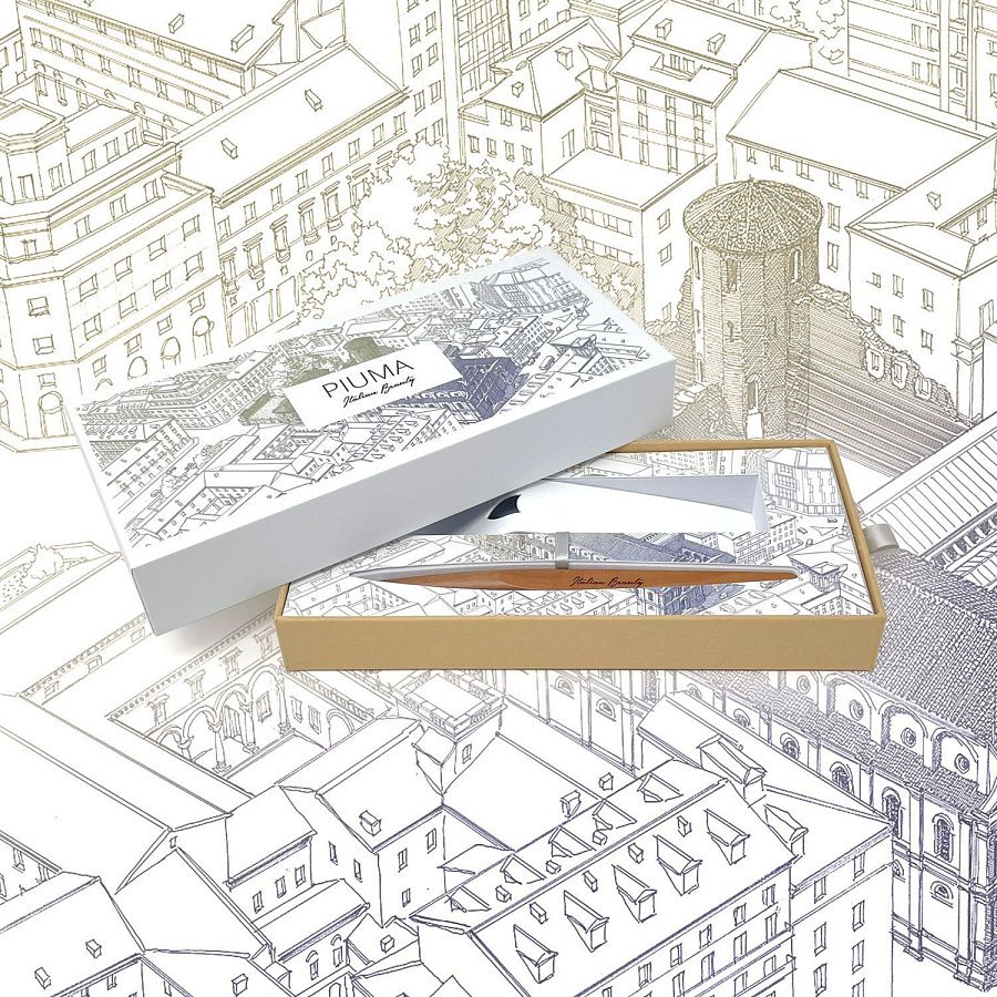 Шариковая ручка Pininfarina Piuma Милан из лимитированной коллекции дизайнеров Pininfarina в сотрудничестве с Francesco Corni Foundation, посвященной красоте Италии и представленной 8 городами. Франческо Корни - выдающийся дизайнер из Модены, посвятивший свою жизнь популяризации истории и архитектуры. Используя трехмерное перспективное видение, он изучает наиболее значимые здания каждого города, выбирает наилучшую точку обзора, чтобы подчеркнуть их особенности, и прорисовывает детали в древней технике калиграфии. Дополняет видение мастера умелое использование цветов, по одному для каждого города. Для Милана дизайнер выбрал центральной точкой церковь Chiesa di san Maurizio на улице corso Magenta и сиреневый цвет, в результате подарочная коробка c ручкой Pininfarina PIUMA становится произведением искусства. PIUMA - ручка динамической формы в виде гусиного пера. Дизайнеры вдохновлялись Кодексом о полете птиц мастера Леонардо да Винчи, целью которого было понять тайну полета и который хранится сейчас в Королевской библиотеке Турина. Piuma находится в постоянном равновесии со своим центром тяжести благодаря белому стальному пьедесталу. На ручке стильный логотип Italian Beauty, она полностью сделана из дерева груши. В ручке используется шариковый стержень Schmidt ® S635 (D1) с синей пастой. Набор упакован в белую подарочную коробку.