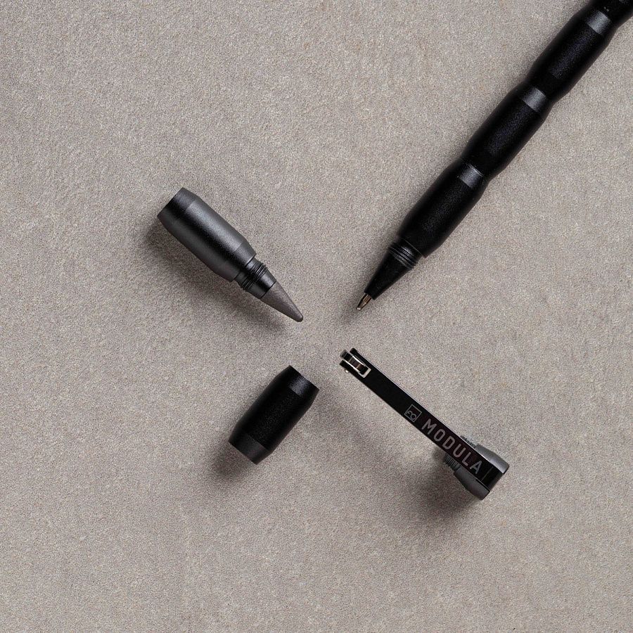 Ручка-трансформер из коллекции Pininfarina Modula черного цвета создана Pininfarina в сотрудничестве с итальянским дизайнером Луиджи Тренти. Получился совершенно необычный пишущий инструмент, сочетающий в себе шариковую ручку и карандаш. Корпус сделан из алюминия и имеет два независимых пишущих узла: шариковую ручку и карандаш со сменным наконечником из материала GrafeeX. GrafeeX - это запатентованный инновационный материал, полученный в результате спекания мелких частиц графита при высоких температурах. То есть он пишет, как обычный графитовый карандаш, но из-за высокой плотности материала крайне экономно расходуется, и его хватает очень надолго. Modula - это своеобразный конструктор, так как она может быть составлена по-разному, вплоть до укорачивания, вследствие того, что один из двух наконечников можно убрать. Оригинальный дизайн клипа. Длина ручки 15 см, диаметр 0,6 см, вес 22 гр. Упакована в черную коробку из дизайнерского многослойного картона 15х3,5х2 см. Вес в упаковке 62 гр. Сделана в Италии.