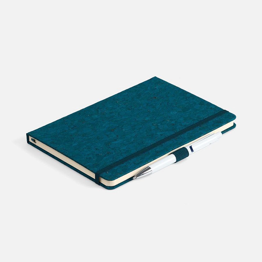 Блокнот с твердой обложкой из натуральной окрашенной пробки, дополнен петлей-резинкой для ручки, ляссе и резинкой в цвет обложки.