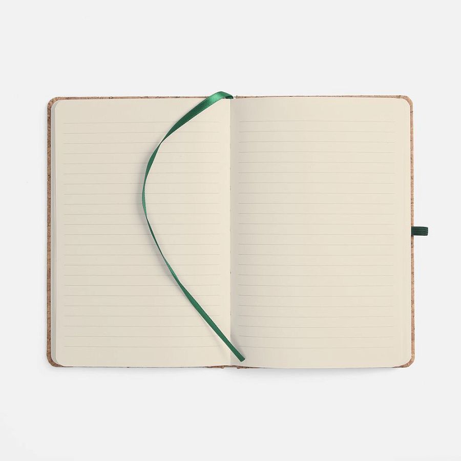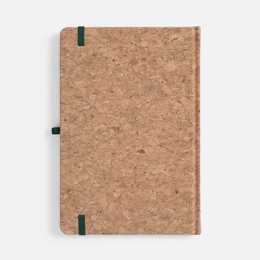 Блокнот в твердой обложке из натуральной неокрашенной пробки, дополнен цветными петлей-резинкой для ручки, ляссе и резинкой на обложку.