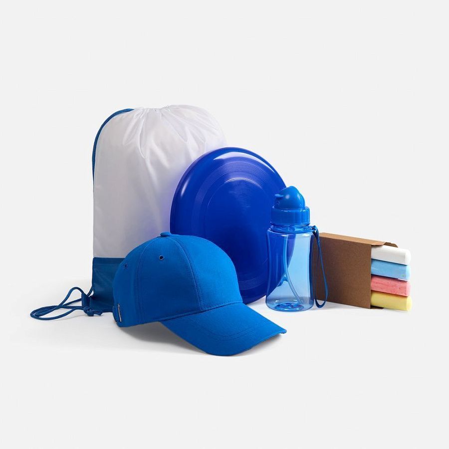 Детский набор для творчества: 4 цветных мелка, бутылка для воды, стильная бейсболка с защитой от солнца, тарелка-фрисби для самых активных и яркий детский рюкзак-мешок — все, что нужно для творческих приключений на свежем воздухе.
