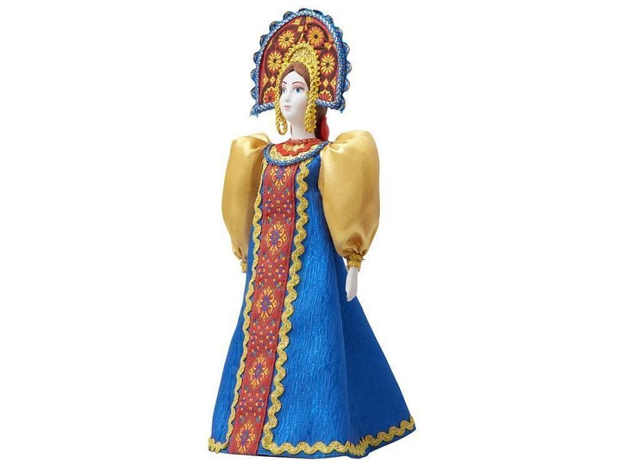 - Фарфоровая кукла в народном костюме ручной работы: алый сарафан с пышными рукавами и расшитый кокошник создают образ русской красавицы в праздничном наряде.