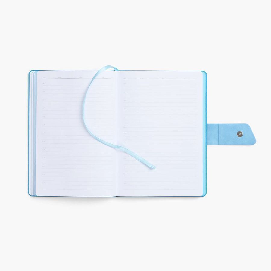 Ежедневник с гибкой обложкой, выполнен из материала La Fite, черный АА и Nubuck Touch, голубой, дополнен голубым ляссе и хлястиком на кнопке.