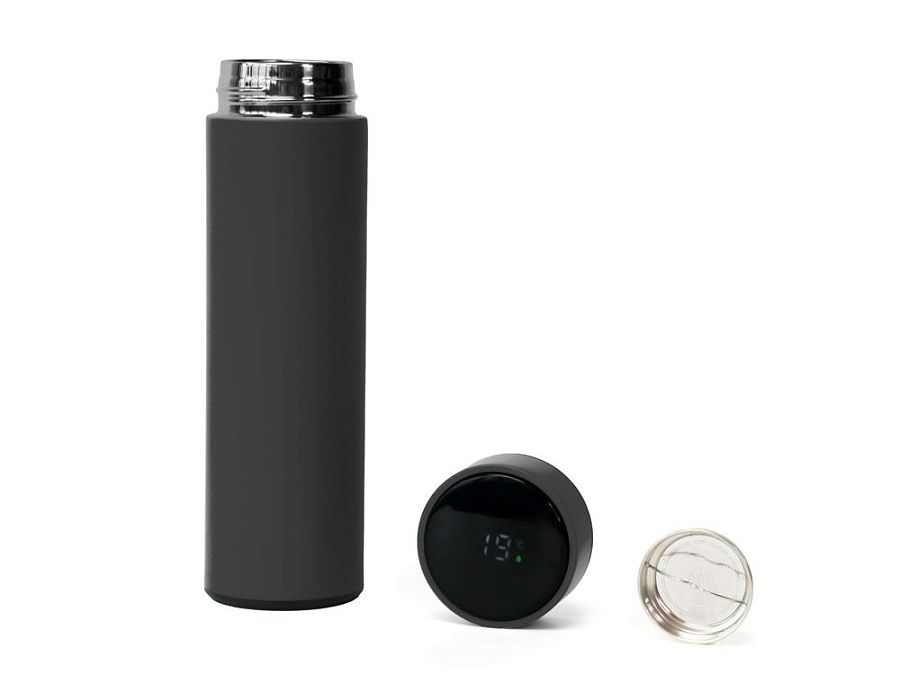 Термос выполнен из нержавеющей стали и покрыт цветным soft-touch покрытием. Его особенность — инновационная крышка со встроенным термометром и LED-дисплеем, который отображает температуру напитка внутри.