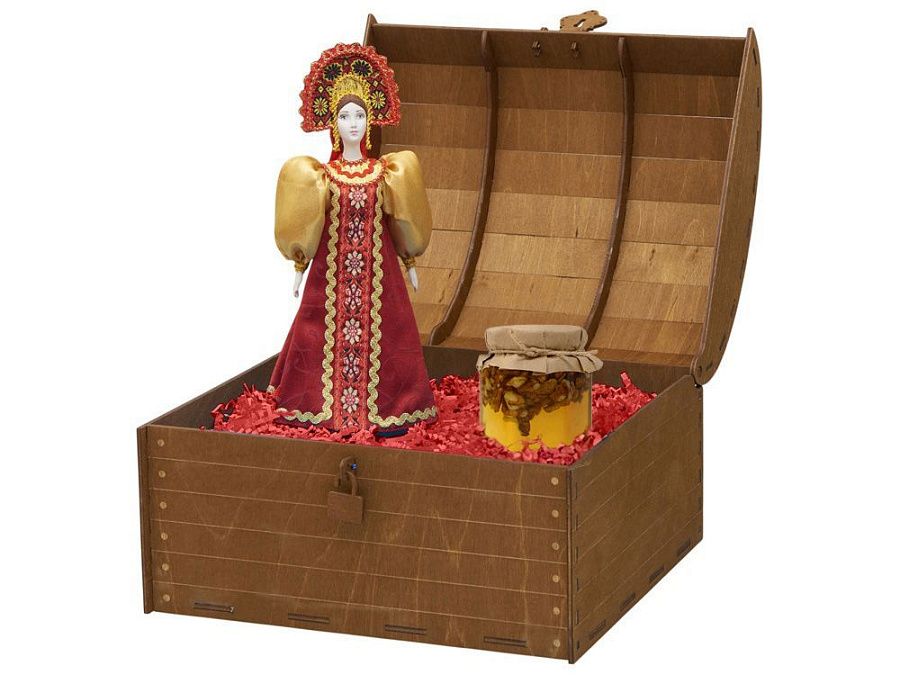 4. Деревянный сундук с изящным замочком превращает вручение подарка в особый ритуал. Дополнительное брендирование шильдом спектрум делает презент эксклюзивным и памятным.