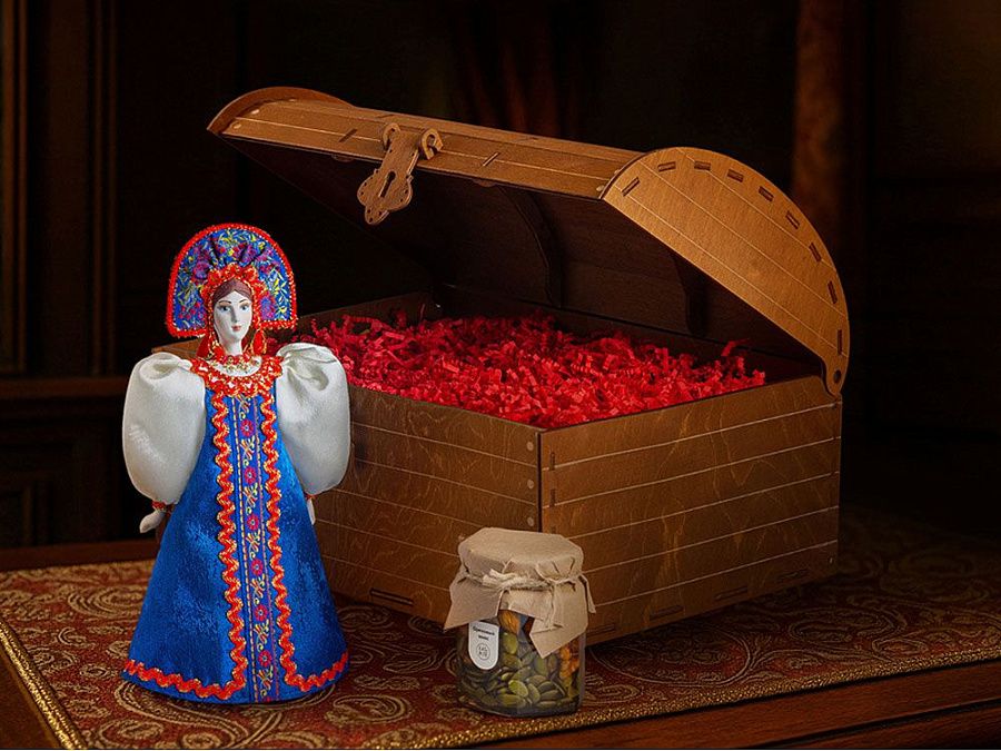 4. Деревянный сундук с изящным замочком превращает вручение подарка в особый ритуал. Дополнительное брендирование шильдом спектрум делает презент эксклюзивным и памятным.