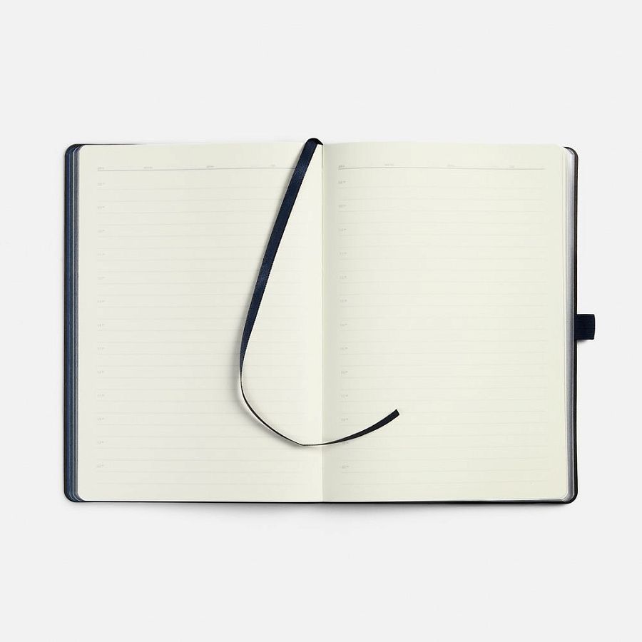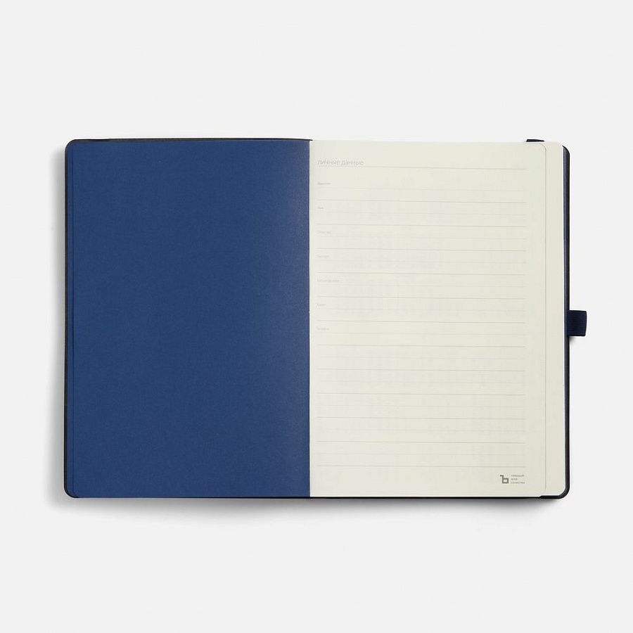 Ежедневник с гибкой обложкой, выполнен из материала Nice Touch, темно-синий ХХ, дополнен цветными ляссе и петлей-резинкой для ручки.