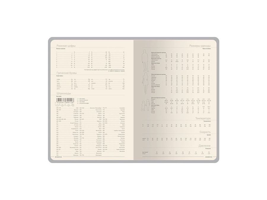 Внутренний блок выполнен из бежевой бумаги плотностью 70 г/кв.м и содержит 14 страниц справочной информации, а также датированные страницы с почасовой разметкой.