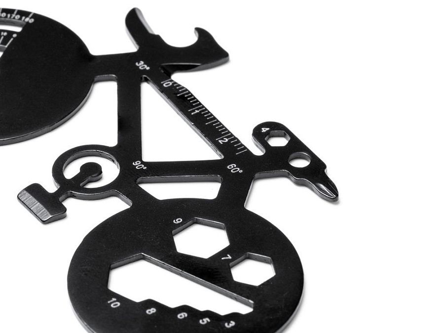 Многофункциональный инструмент из нержавеющей стали в форме велосипеда. 11 функций: открывалка для консервных банок, угловой транспортир, отвертки, гаечные ключи и линейки.