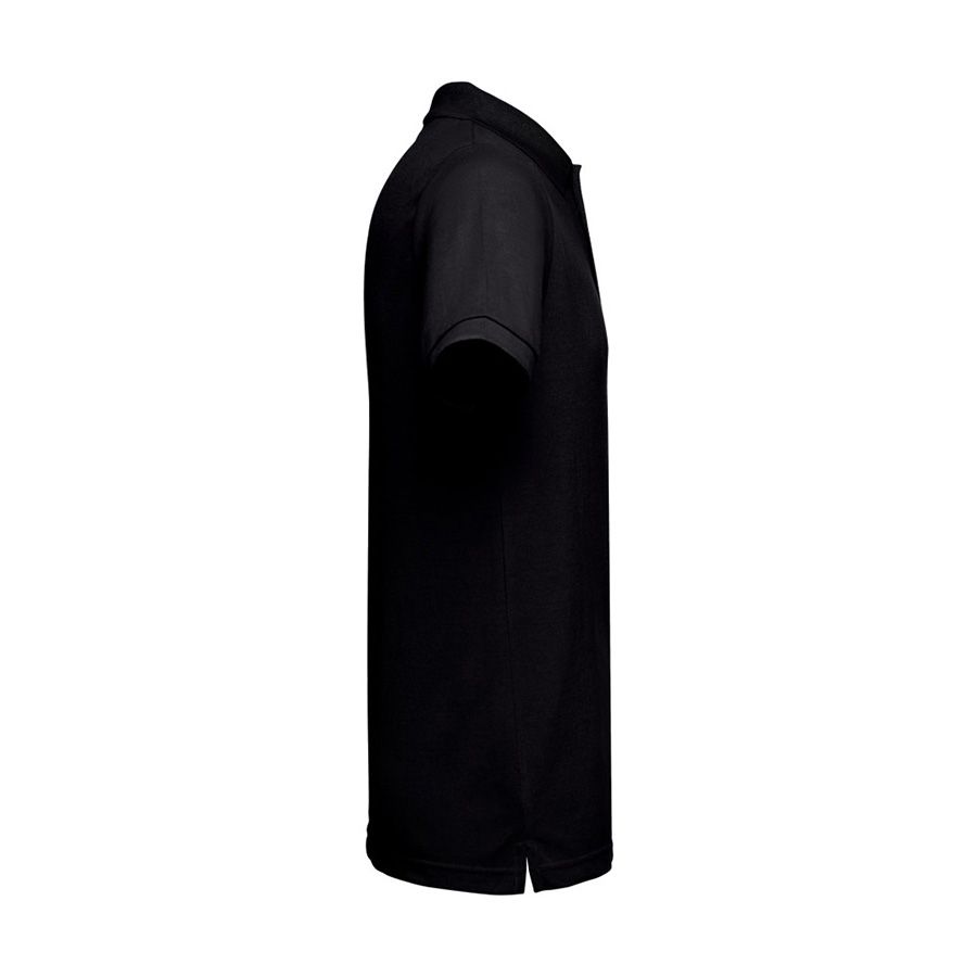 Мужская рубашка-поло из смесовой ткани-пике. Полотно футболки упругое и гладкое благодаря обработке ферментами "enzyme wash" и сохраняет форму при стирке. Модель полуприлегающего силуэта. Благодаря манжете из риба 1х1 рукав смотрится очень аккуратно. Воротник также выполнен из риба 1х1, внутри ворота - укрепляющая тесьма по горловине. Планка с 3 пуговицами в тон изделия. запасная пуговица на ярлыке во внутреннем боковом шве.Цвет, близкий к Pantone Black