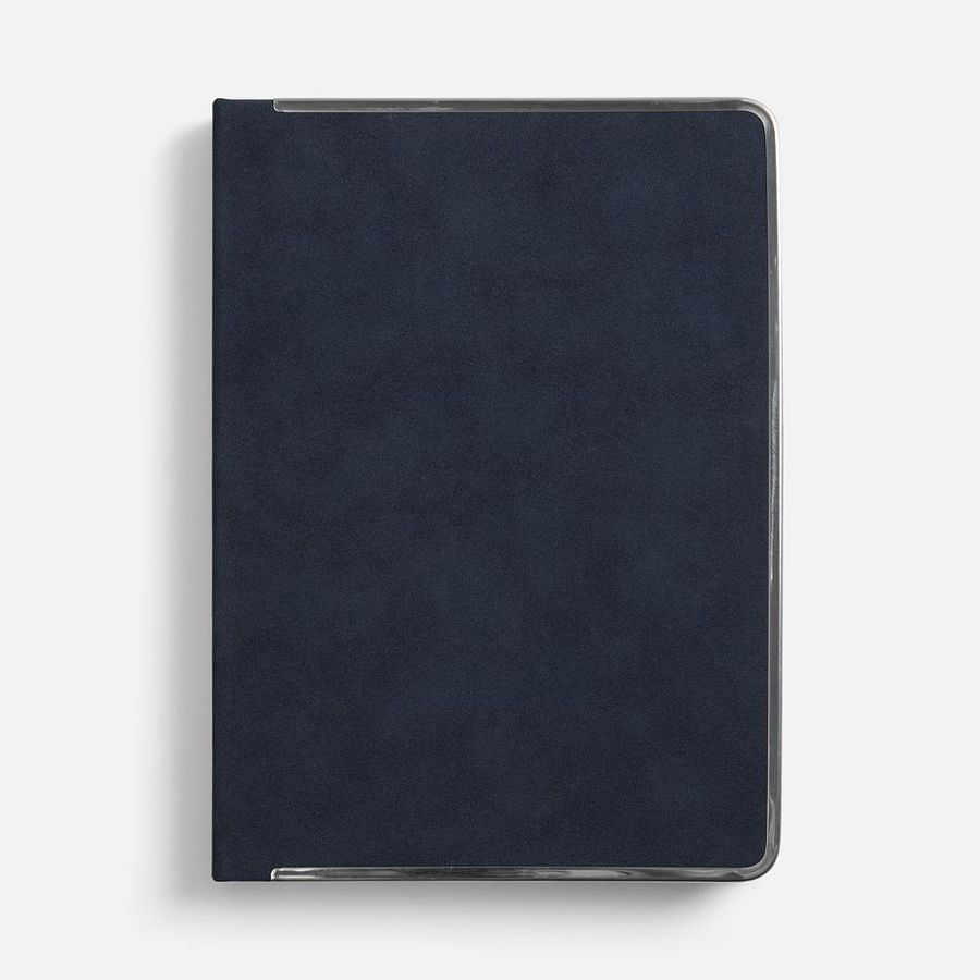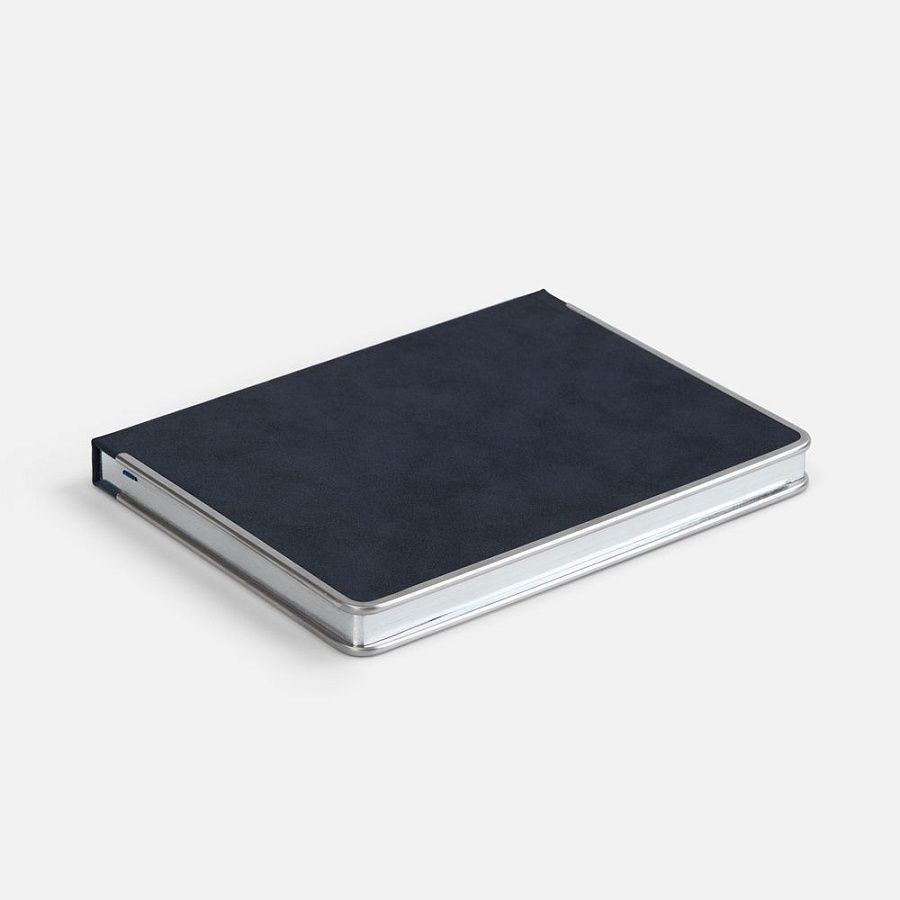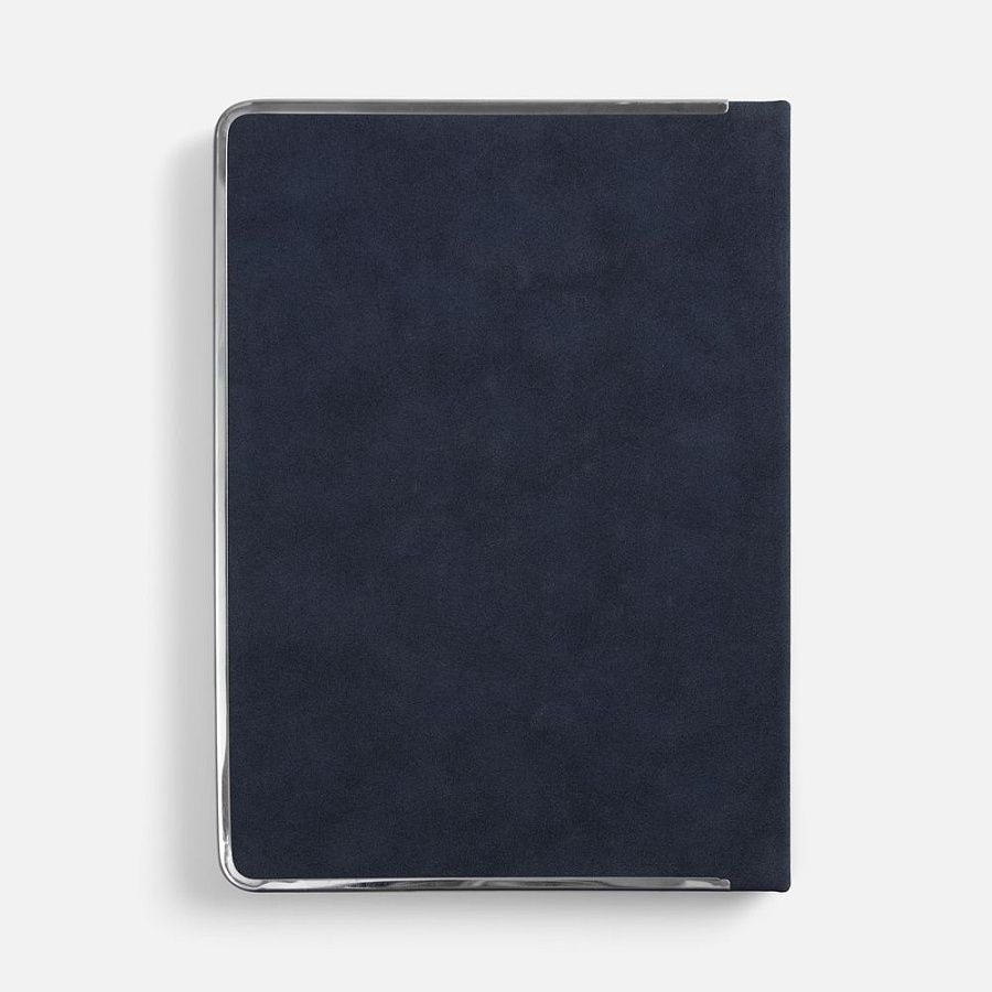 Ежедневник с твердой обложкой и серебристым обрезом блока. Выполнен из материала Nubuck, темно-синий ХХ, дополнен синим ляссе и металлическими рамками с двух сторон обложки.