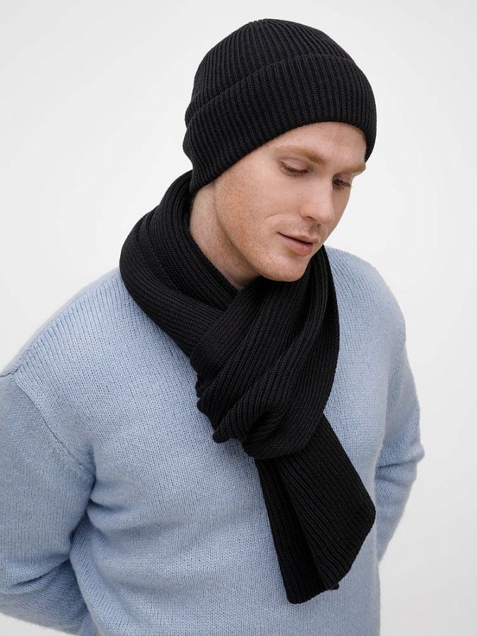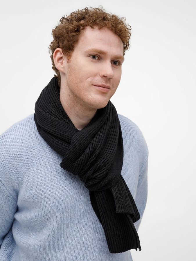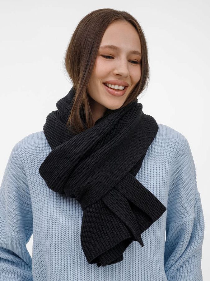 Широкий шарф из мягкой полушерстяной пряжи с выразительной фактурной вязкой создает современный запоминающийся образ.