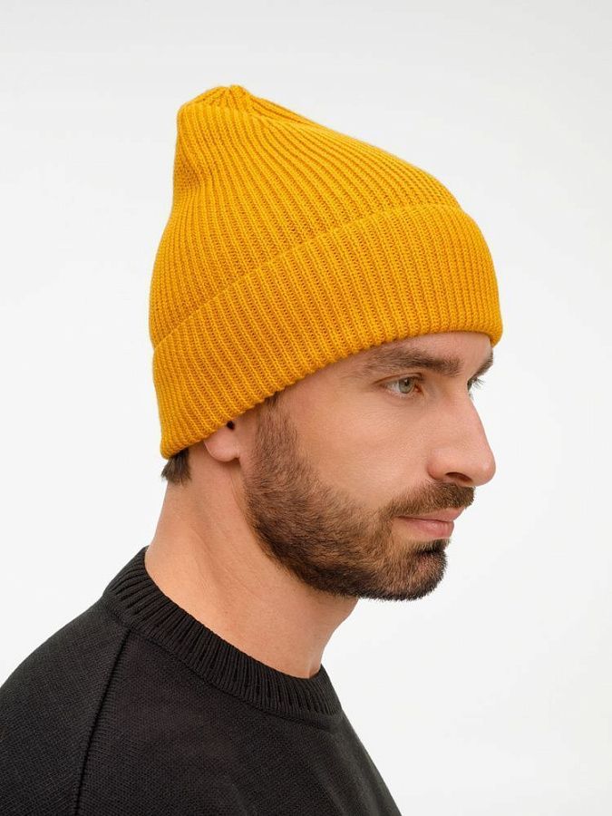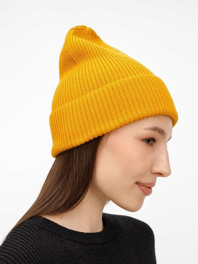 Однослойная шапка фактурной вязки с отворотом.