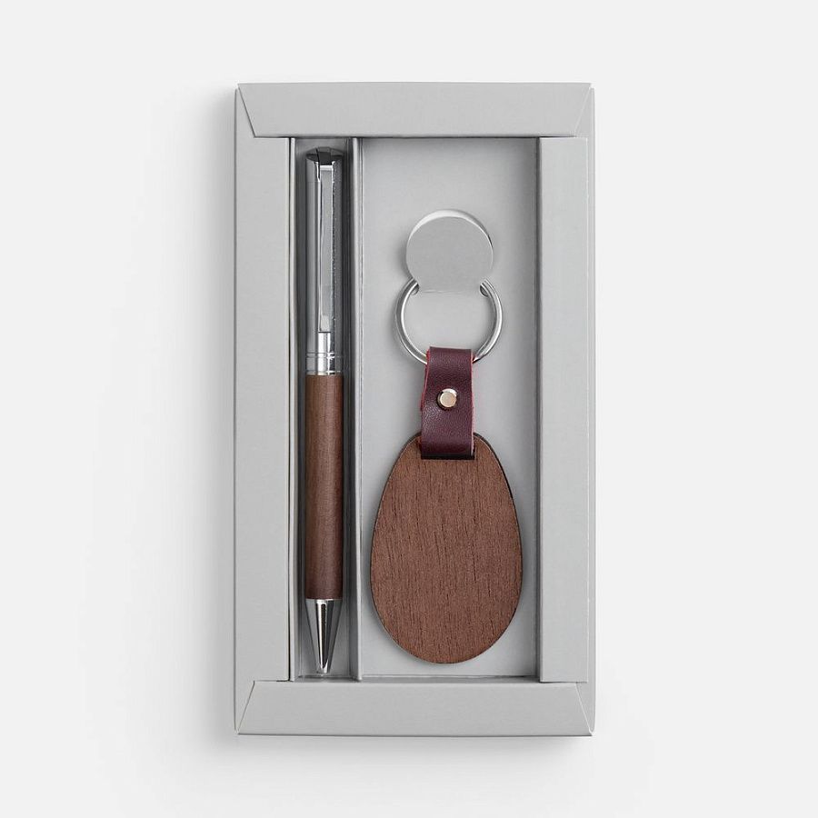 ручка - металл, нижняя часть - дерево, орех; брелок - дерево, сапелли; металл; коробка - картон
