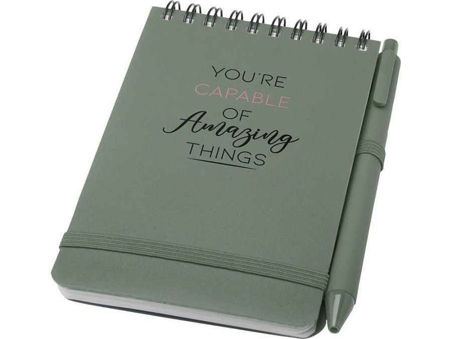 Блокнот Thalaasa формата A5 в твердой обложке изготовлен из переработанного океанического пластика и содержит 80 линованных листов кремовой бумаги плотностью 70 г/м². Блокнот имеет закругленные углы, эластичную застежку и петлю для ручки. Шариковая ручка с черными чернилами также изготовлена из переработанного океанического пластика. Длина непрерывной линии: 1000 метров. Размер пера: 1,0 мм.
