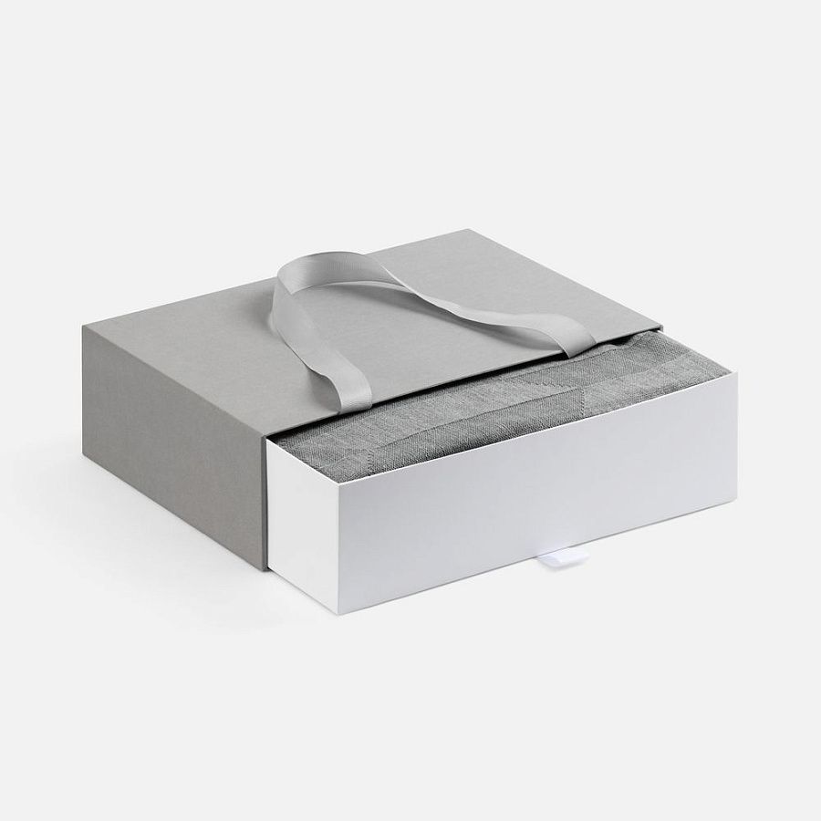 Внешний короб каширован дизайнерской бумаги и оснащен прочными ручками из репсовой ленты. Внутренний короб отделан белой бумагой, ламинированной матовой пленкой.