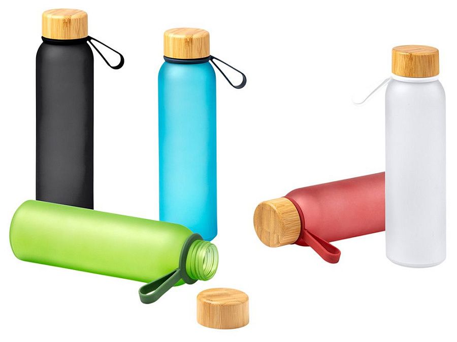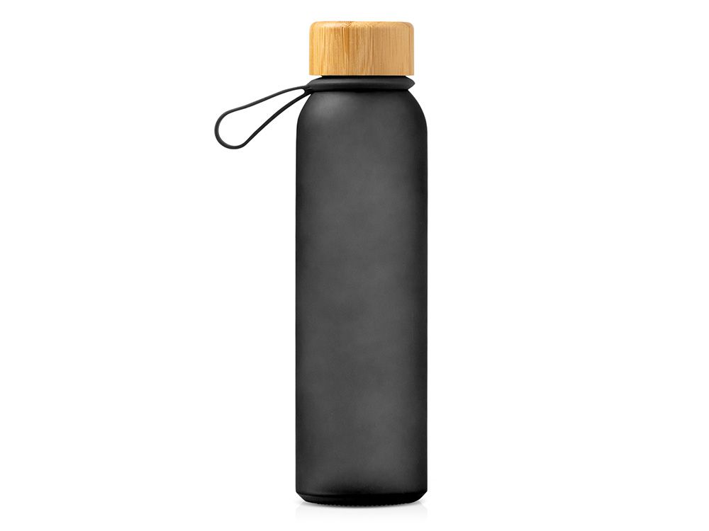 Полупрозрачная бутылка из переработанного стекла. Бамбуковая крышка с держателем. Объём: 500 мл. Поставляется в индивидуальной коробке.