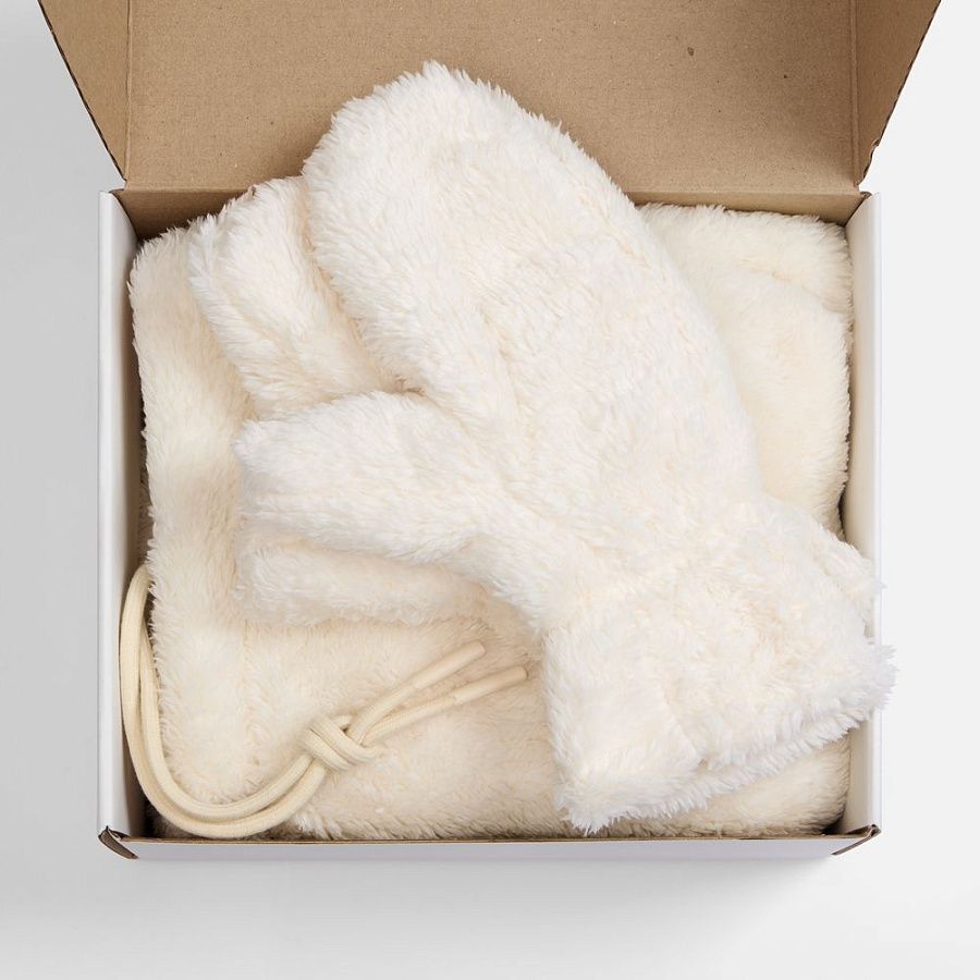 балаклава - полиэстер 100%, плотность 280 г/м², длинноворсовый флис; варежки - полиэстер 100%, плотность 280 г/м², длинноворсовый флис; коробка - микрогофрокартон, плотность 385 г/м²