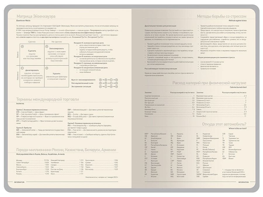 Недатированные страницы в серую линейку имеют отдельное место для проставления числа месяца и дня недели. Справочный блок на 17 страницах содержит полезную информацию из различных областей.