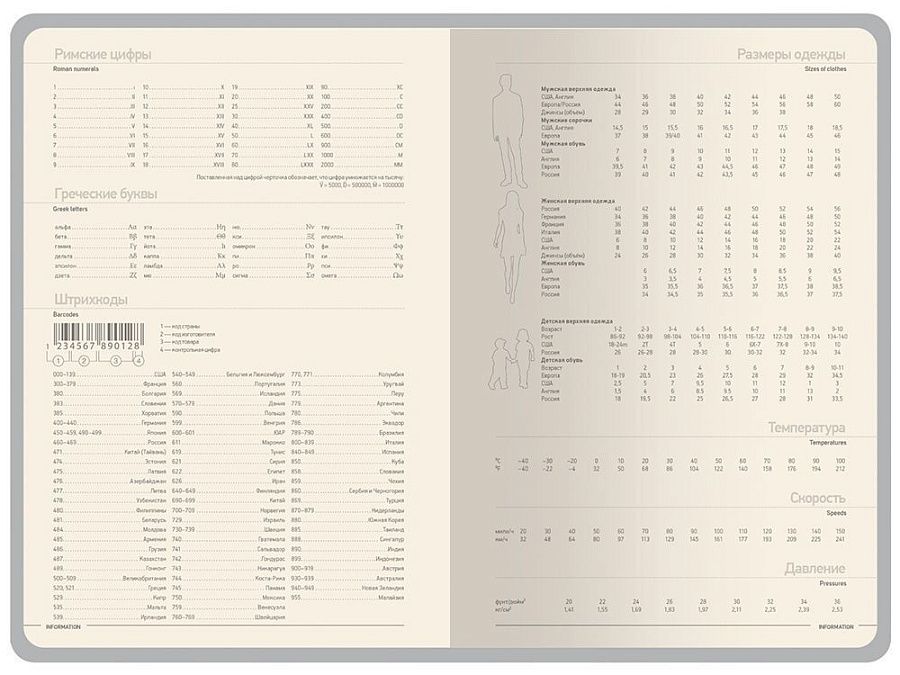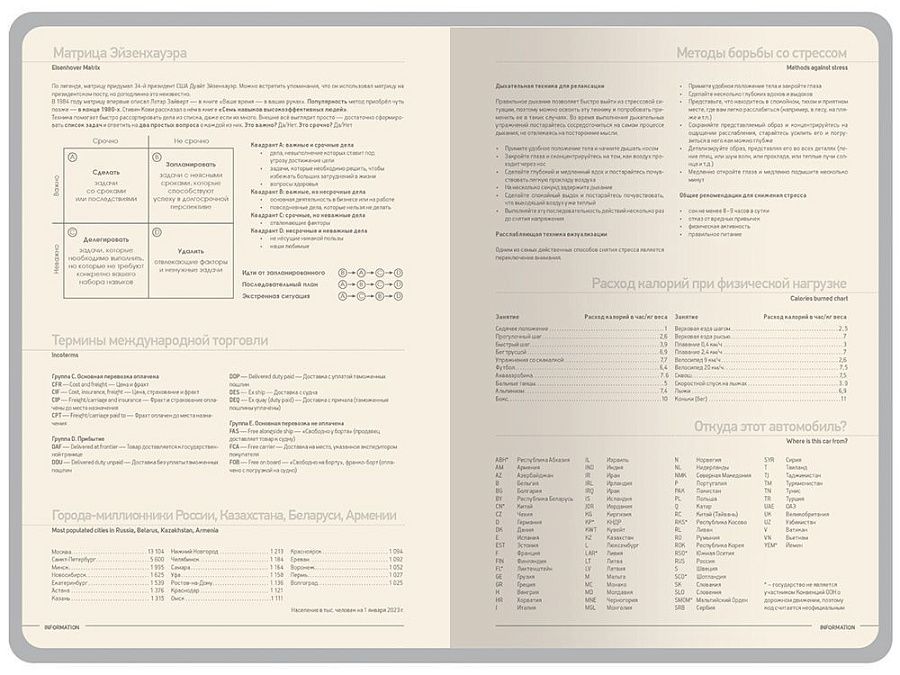 Недатированные страницы в серую линейку имеют отдельное место для проставления числа месяца и дня недели. Справочный блок на 17 страницах содержит полезную информацию из различных областей.