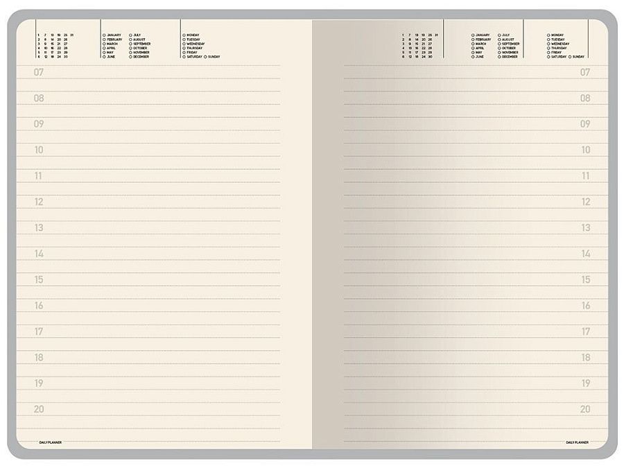 Недатированные страницы в серую линейку имеют отдельное место для проставления числа месяца и дня недели. Справочный блок на 17 страницах содержит полезную информацию из различных областей.