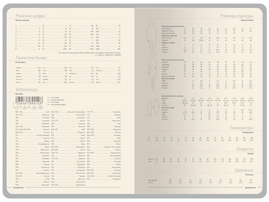 Недатированные страницы в серую линейку имеют отдельное место для проставления числа месяца и дня недели. Справочный блок на 17 страницах содержит полезную информацию из различных областей.